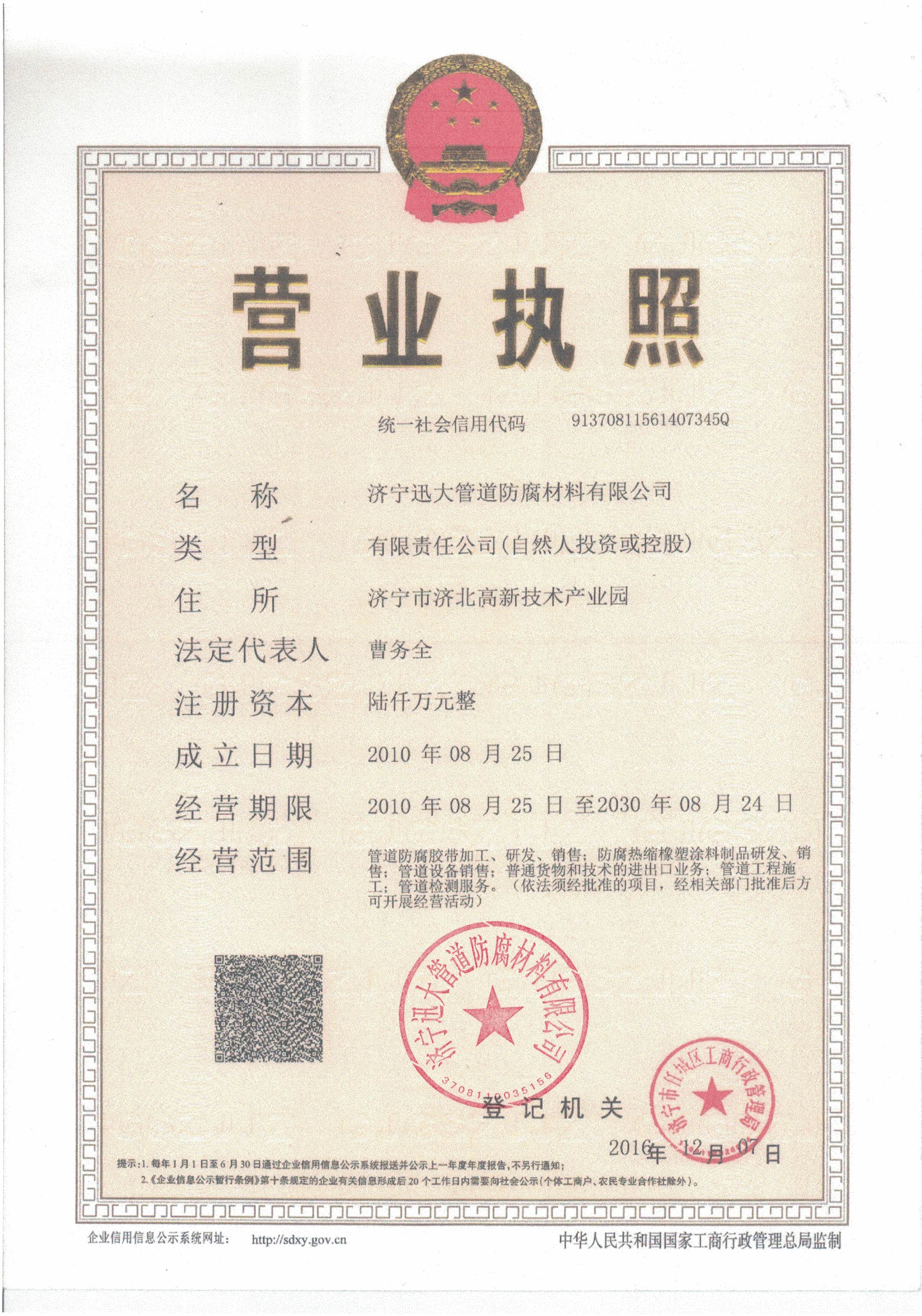 濟(jì)寧迅大管道防腐材料有限公司是國(guó)內(nèi)規(guī)模大、防腐產(chǎn)品齊全、設(shè)備先進(jìn)、質(zhì)量穩(wěn)定的集研發(fā)、生產(chǎn)、銷(xiāo)售的綜合性防腐、防水材料生產(chǎn)企業(yè)?! ?防腐主要產(chǎn)品有:聚乙烯管道防腐膠帶、聚乙烯膠粘帶、聚丙烯防腐膠帶、鋁箔防腐膠粘帶、丁基防水膠帶、管道膠帶、輻射交聯(lián)聚乙烯防腐熱收縮套、熱收縮帶、管道防腐防水熱縮帽、防腐帶等管道防腐產(chǎn)品?!”竟緸楣煞葜破髽I(yè),投資總額4200萬(wàn)元,注冊(cè)資本600萬(wàn)元。固定資產(chǎn)2190萬(wàn)元,流動(dòng)資產(chǎn)4271萬(wàn)元,凈值2890萬(wàn)元?! 」締T工198人,技術(shù)人員32人,銷(xiāo)售…
